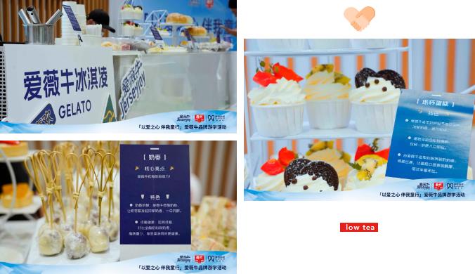 精美的甜品茶歇和奶粉品鉴环节,甜品包括有用爱薇牛奶粉制作而成的冰淇淋和小蛋糕。